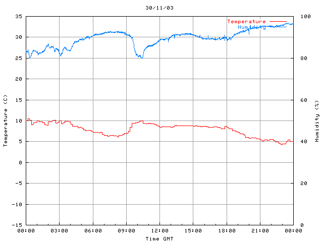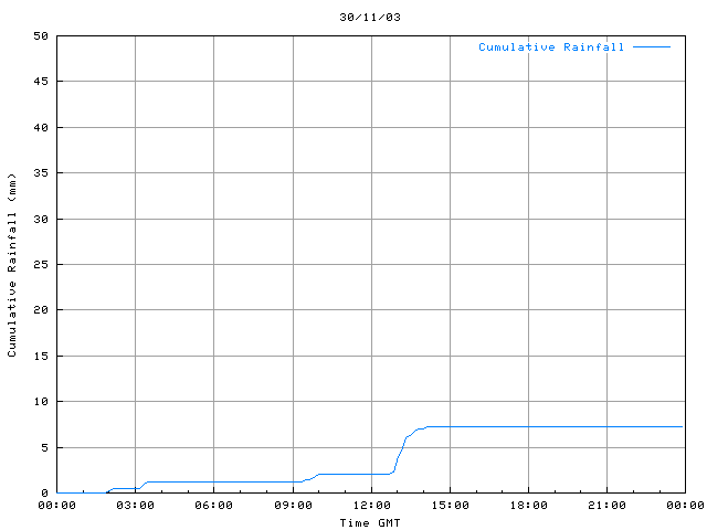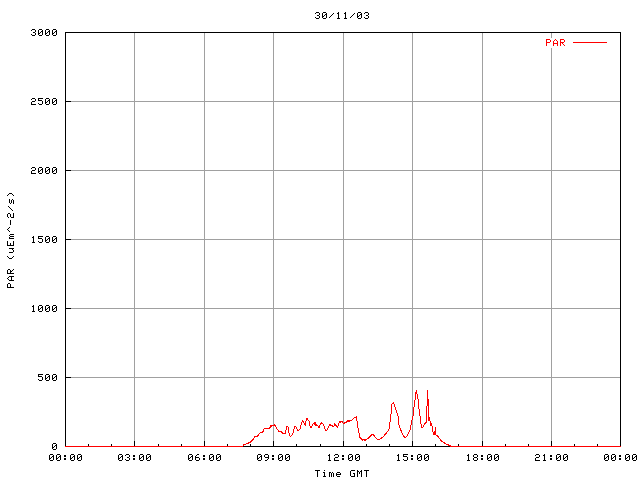 The PML meteorological station, situated on the south-west corner of the building roof, consists of a Hygroclip S3 temperature and humidity sensor housed in a radiation shield, a Mierij Meteo solid state wind sensor (MMW-005), a Chelsea instruments half-hemisphere PAR sensor, a Li-Cor pyranometer (LI-200SZ) and an Omni Instruments 6" tipping bucket raingauge (RG200). The data are logged every 5 minutes using a Pace Scientific XR5 data logger. The real-time rainfall data is likely in error - the correct values will be displayed after a time lag of approximately 24 hours. The meteorological station is sheltered from winds in the north-east and underestimates winds from this quarter. To use these data please contact Dr Tim Smyth.