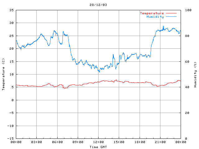 The PML meteorological station, situated on the south-west corner of the building roof, consists of a Hygroclip S3 temperature and humidity sensor housed in a radiation shield, a Mierij Meteo solid state wind sensor (MMW-005), a Chelsea instruments half-hemisphere PAR sensor, a Li-Cor pyranometer (LI-200SZ) and an Omni Instruments 6" tipping bucket raingauge (RG200). The data are logged every 5 minutes using a Pace Scientific XR5 data logger. The real-time rainfall data is likely in error - the correct values will be displayed after a time lag of approximately 24 hours. The meteorological station is sheltered from winds in the north-east and underestimates winds from this quarter. To use these data please contact Dr Tim Smyth.