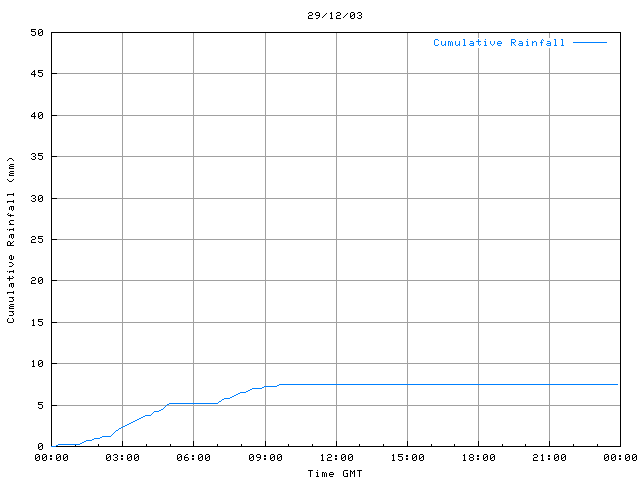 The PML meteorological station, situated on the south-west corner of the building roof, consists of a Hygroclip S3 temperature and humidity sensor housed in a radiation shield, a Mierij Meteo solid state wind sensor (MMW-005), a Chelsea instruments half-hemisphere PAR sensor, a Li-Cor pyranometer (LI-200SZ) and an Omni Instruments 6" tipping bucket raingauge (RG200). The data are logged every 5 minutes using a Pace Scientific XR5 data logger. The real-time rainfall data is likely in error - the correct values will be displayed after a time lag of approximately 24 hours. The meteorological station is sheltered from winds in the north-east and underestimates winds from this quarter. To use these data please contact Dr Tim Smyth.