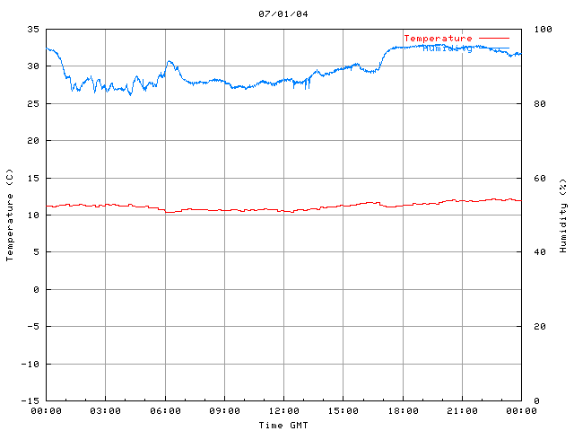 The PML meteorological station, situated on the south-west corner of the building roof, consists of a Hygroclip S3 temperature and humidity sensor housed in a radiation shield, a Mierij Meteo solid state wind sensor (MMW-005), a Chelsea instruments half-hemisphere PAR sensor, a Li-Cor pyranometer (LI-200SZ) and an Omni Instruments 6" tipping bucket raingauge (RG200). The data are logged every 5 minutes using a Pace Scientific XR5 data logger. The real-time rainfall data is likely in error - the correct values will be displayed after a time lag of approximately 24 hours. The meteorological station is sheltered from winds in the north-east and underestimates winds from this quarter. To use these data please contact Dr Tim Smyth.