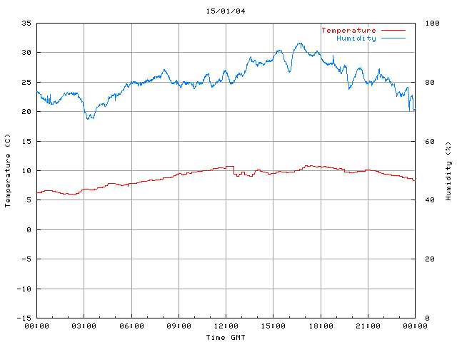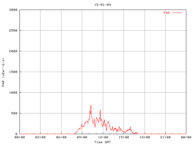 The PML meteorological station, situated on the south-west corner of the building roof, consists of a Hygroclip S3 temperature and humidity sensor housed in a radiation shield, a Mierij Meteo solid state wind sensor (MMW-005), a Chelsea instruments half-hemisphere PAR sensor, a Li-Cor pyranometer (LI-200SZ) and an Omni Instruments 6" tipping bucket raingauge (RG200). The data are logged every 5 minutes using a Pace Scientific XR5 data logger. The real-time rainfall data is likely in error - the correct values will be displayed after a time lag of approximately 24 hours. The meteorological station is sheltered from winds in the north-east and underestimates winds from this quarter. To use these data please contact Dr Tim Smyth.