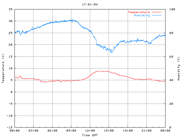 The PML meteorological station, situated on the south-west corner of the building roof, consists of a Hygroclip S3 temperature and humidity sensor housed in a radiation shield, a Mierij Meteo solid state wind sensor (MMW-005), a Chelsea instruments half-hemisphere PAR sensor, a Li-Cor pyranometer (LI-200SZ) and an Omni Instruments 6" tipping bucket raingauge (RG200). The data are logged every 5 minutes using a Pace Scientific XR5 data logger. The real-time rainfall data is likely in error - the correct values will be displayed after a time lag of approximately 24 hours. The meteorological station is sheltered from winds in the north-east and underestimates winds from this quarter. To use these data please contact Dr Tim Smyth.
