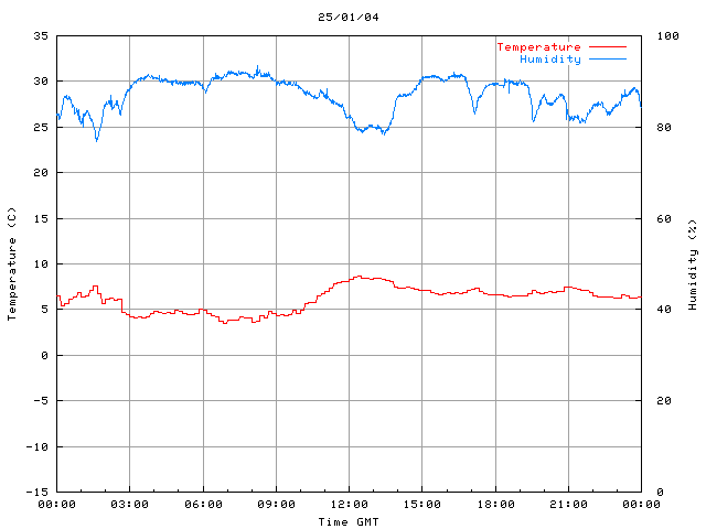 The PML meteorological station, situated on the south-west corner of the building roof, consists of a Hygroclip S3 temperature and humidity sensor housed in a radiation shield, a Mierij Meteo solid state wind sensor (MMW-005), a Chelsea instruments half-hemisphere PAR sensor, a Li-Cor pyranometer (LI-200SZ) and an Omni Instruments 6" tipping bucket raingauge (RG200). The data are logged every 5 minutes using a Pace Scientific XR5 data logger. The real-time rainfall data is likely in error - the correct values will be displayed after a time lag of approximately 24 hours. The meteorological station is sheltered from winds in the north-east and underestimates winds from this quarter. To use these data please contact Dr Tim Smyth.