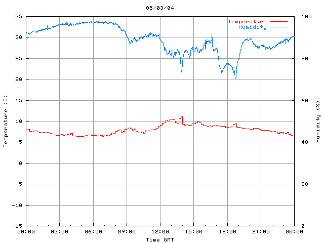 The PML meteorological station, situated on the south-west corner of the building roof, consists of a Hygroclip S3 temperature and humidity sensor housed in a radiation shield, a Mierij Meteo solid state wind sensor (MMW-005), a Chelsea instruments half-hemisphere PAR sensor, a Li-Cor pyranometer (LI-200SZ) and an Omni Instruments 6" tipping bucket raingauge (RG200). The data are logged every 5 minutes using a Pace Scientific XR5 data logger. The real-time rainfall data is likely in error - the correct values will be displayed after a time lag of approximately 24 hours. The meteorological station is sheltered from winds in the north-east and underestimates winds from this quarter. To use these data please contact Dr Tim Smyth.