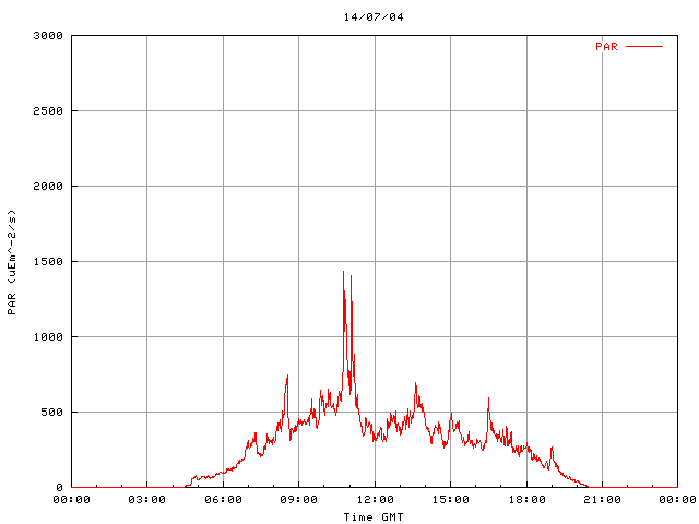 The PML meteorological station, situated on the south-west corner of the building roof, consists of a Hygroclip S3 temperature and humidity sensor housed in a radiation shield, a Mierij Meteo solid state wind sensor (MMW-005), a Chelsea instruments half-hemisphere PAR sensor, a Li-Cor pyranometer (LI-200SZ) and an Omni Instruments 6" tipping bucket raingauge (RG200). The data are logged every 5 minutes using a Pace Scientific XR5 data logger. The real-time rainfall data is likely in error - the correct values will be displayed after a time lag of approximately 24 hours. The meteorological station is sheltered from winds in the north-east and underestimates winds from this quarter. To use these data please contact Dr Tim Smyth.
