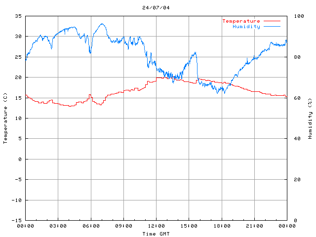 The PML meteorological station, situated on the south-west corner of the building roof, consists of a Hygroclip S3 temperature and humidity sensor housed in a radiation shield, a Mierij Meteo solid state wind sensor (MMW-005), a Chelsea instruments half-hemisphere PAR sensor, a Li-Cor pyranometer (LI-200SZ) and an Omni Instruments 6" tipping bucket raingauge (RG200). The data are logged every 5 minutes using a Pace Scientific XR5 data logger. The real-time rainfall data is likely in error - the correct values will be displayed after a time lag of approximately 24 hours. The meteorological station is sheltered from winds in the north-east and underestimates winds from this quarter. To use these data please contact Dr Tim Smyth.