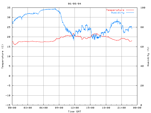 The PML meteorological station, situated on the south-west corner of the building roof, consists of a Hygroclip S3 temperature and humidity sensor housed in a radiation shield, a Mierij Meteo solid state wind sensor (MMW-005), a Chelsea instruments half-hemisphere PAR sensor, a Li-Cor pyranometer (LI-200SZ) and an Omni Instruments 6" tipping bucket raingauge (RG200). The data are logged every 5 minutes using a Pace Scientific XR5 data logger. The real-time rainfall data is likely in error - the correct values will be displayed after a time lag of approximately 24 hours. The meteorological station is sheltered from winds in the north-east and underestimates winds from this quarter. To use these data please contact Dr Tim Smyth.