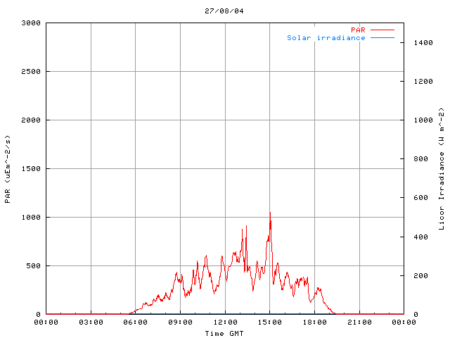 The PML meteorological station, situated on the south-west corner of the building roof, consists of a Hygroclip S3 temperature and humidity sensor housed in a radiation shield, a Mierij Meteo solid state wind sensor (MMW-005), a Chelsea instruments half-hemisphere PAR sensor, a Li-Cor pyranometer (LI-200SZ) and an Omni Instruments 6" tipping bucket raingauge (RG200). The data are logged every 5 minutes using a Pace Scientific XR5 data logger. The real-time rainfall data is likely in error - the correct values will be displayed after a time lag of approximately 24 hours. The meteorological station is sheltered from winds in the north-east and underestimates winds from this quarter. To use these data please contact Dr Tim Smyth.