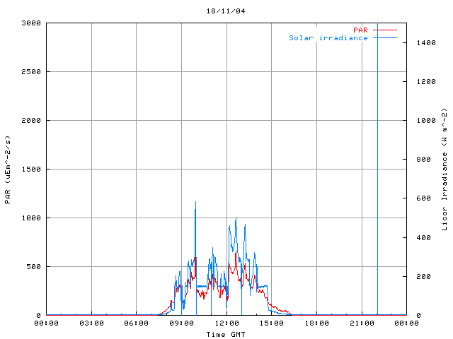 The PML meteorological station, situated on the south-west corner of the building roof, consists of a Hygroclip S3 temperature and humidity sensor housed in a radiation shield, a Mierij Meteo solid state wind sensor (MMW-005), a Chelsea instruments half-hemisphere PAR sensor, a Li-Cor pyranometer (LI-200SZ) and an Omni Instruments 6" tipping bucket raingauge (RG200). The data are logged every 5 minutes using a Pace Scientific XR5 data logger. The real-time rainfall data is likely in error - the correct values will be displayed after a time lag of approximately 24 hours. The meteorological station is sheltered from winds in the north-east and underestimates winds from this quarter. To use these data please contact Dr Tim Smyth.