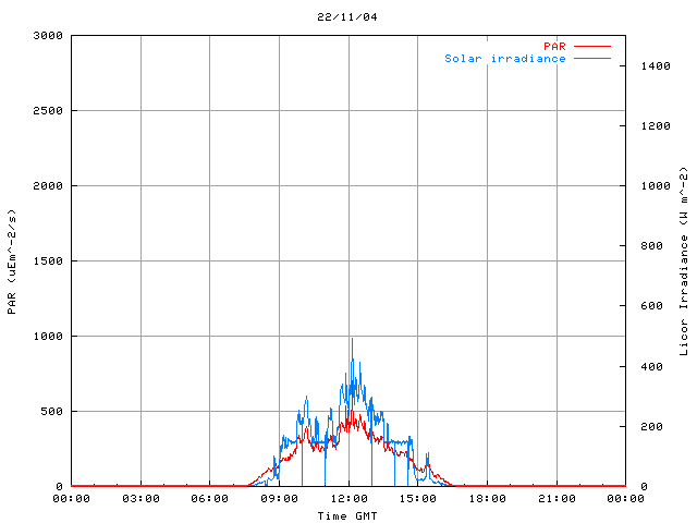 The PML meteorological station, situated on the south-west corner of the building roof, consists of a Hygroclip S3 temperature and humidity sensor housed in a radiation shield, a Mierij Meteo solid state wind sensor (MMW-005), a Chelsea instruments half-hemisphere PAR sensor, a Li-Cor pyranometer (LI-200SZ) and an Omni Instruments 6" tipping bucket raingauge (RG200). The data are logged every 5 minutes using a Pace Scientific XR5 data logger. The real-time rainfall data is likely in error - the correct values will be displayed after a time lag of approximately 24 hours. The meteorological station is sheltered from winds in the north-east and underestimates winds from this quarter. To use these data please contact Dr Tim Smyth.