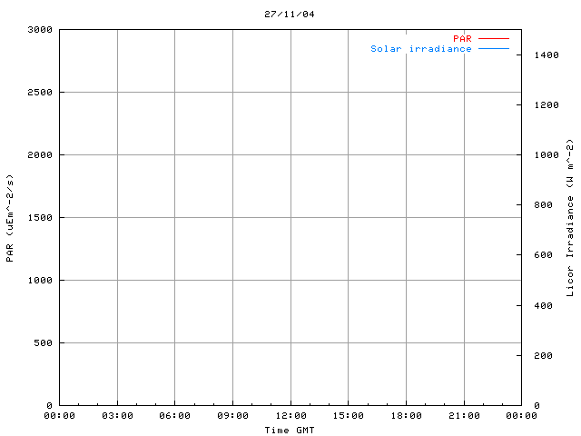 The PML meteorological station, situated on the south-west corner of the building roof, consists of a Hygroclip S3 temperature and humidity sensor housed in a radiation shield, a Mierij Meteo solid state wind sensor (MMW-005), a Chelsea instruments half-hemisphere PAR sensor, a Li-Cor pyranometer (LI-200SZ) and an Omni Instruments 6" tipping bucket raingauge (RG200). The data are logged every 5 minutes using a Pace Scientific XR5 data logger. The real-time rainfall data is likely in error - the correct values will be displayed after a time lag of approximately 24 hours. The meteorological station is sheltered from winds in the north-east and underestimates winds from this quarter. To use these data please contact Dr Tim Smyth.