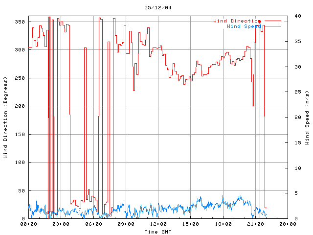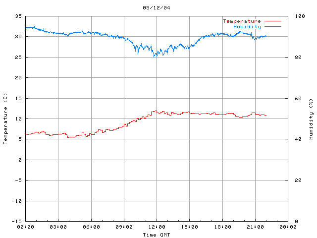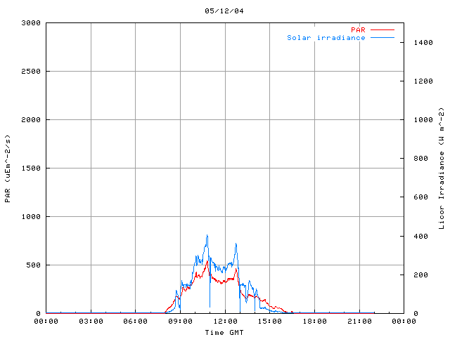 The PML meteorological station, situated on the south-west corner of the building roof, consists of a Hygroclip S3 temperature and humidity sensor housed in a radiation shield, a Mierij Meteo solid state wind sensor (MMW-005), a Chelsea instruments half-hemisphere PAR sensor, a Li-Cor pyranometer (LI-200SZ) and an Omni Instruments 6" tipping bucket raingauge (RG200). The data are logged every 5 minutes using a Pace Scientific XR5 data logger. The real-time rainfall data is likely in error - the correct values will be displayed after a time lag of approximately 24 hours. The meteorological station is sheltered from winds in the north-east and underestimates winds from this quarter. To use these data please contact Dr Tim Smyth.