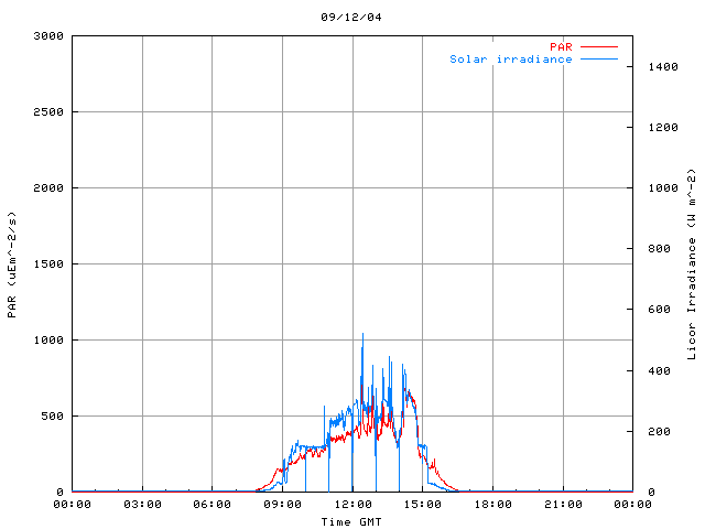 The PML meteorological station, situated on the south-west corner of the building roof, consists of a Hygroclip S3 temperature and humidity sensor housed in a radiation shield, a Mierij Meteo solid state wind sensor (MMW-005), a Chelsea instruments half-hemisphere PAR sensor, a Li-Cor pyranometer (LI-200SZ) and an Omni Instruments 6" tipping bucket raingauge (RG200). The data are logged every 5 minutes using a Pace Scientific XR5 data logger. The real-time rainfall data is likely in error - the correct values will be displayed after a time lag of approximately 24 hours. The meteorological station is sheltered from winds in the north-east and underestimates winds from this quarter. To use these data please contact Dr Tim Smyth.