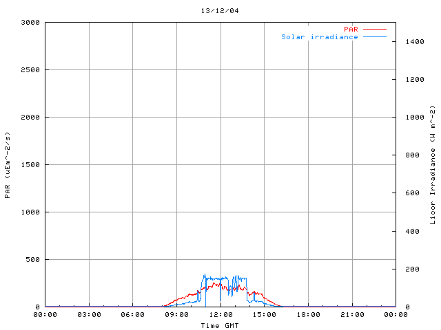The PML meteorological station, situated on the south-west corner of the building roof, consists of a Hygroclip S3 temperature and humidity sensor housed in a radiation shield, a Mierij Meteo solid state wind sensor (MMW-005), a Chelsea instruments half-hemisphere PAR sensor, a Li-Cor pyranometer (LI-200SZ) and an Omni Instruments 6" tipping bucket raingauge (RG200). The data are logged every 5 minutes using a Pace Scientific XR5 data logger. The real-time rainfall data is likely in error - the correct values will be displayed after a time lag of approximately 24 hours. The meteorological station is sheltered from winds in the north-east and underestimates winds from this quarter. To use these data please contact Dr Tim Smyth.