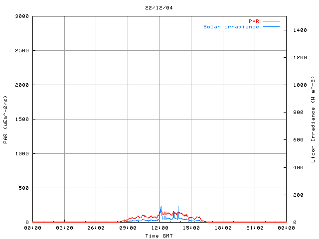 The PML meteorological station, situated on the south-west corner of the building roof, consists of a Hygroclip S3 temperature and humidity sensor housed in a radiation shield, a Mierij Meteo solid state wind sensor (MMW-005), a Chelsea instruments half-hemisphere PAR sensor, a Li-Cor pyranometer (LI-200SZ) and an Omni Instruments 6" tipping bucket raingauge (RG200). The data are logged every 5 minutes using a Pace Scientific XR5 data logger. The real-time rainfall data is likely in error - the correct values will be displayed after a time lag of approximately 24 hours. The meteorological station is sheltered from winds in the north-east and underestimates winds from this quarter. To use these data please contact Dr Tim Smyth.