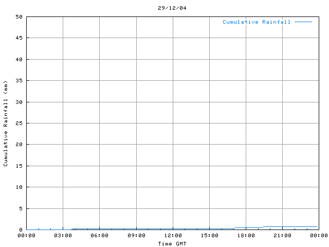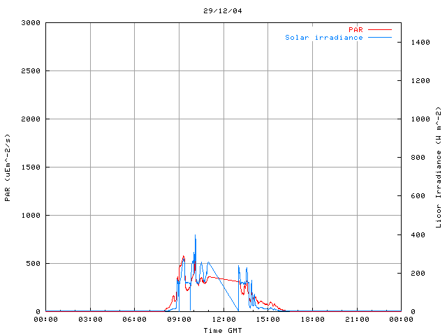The PML meteorological station, situated on the south-west corner of the building roof, consists of a Hygroclip S3 temperature and humidity sensor housed in a radiation shield, a Mierij Meteo solid state wind sensor (MMW-005), a Chelsea instruments half-hemisphere PAR sensor, a Li-Cor pyranometer (LI-200SZ) and an Omni Instruments 6" tipping bucket raingauge (RG200). The data are logged every 5 minutes using a Pace Scientific XR5 data logger. The real-time rainfall data is likely in error - the correct values will be displayed after a time lag of approximately 24 hours. The meteorological station is sheltered from winds in the north-east and underestimates winds from this quarter. To use these data please contact Dr Tim Smyth.
