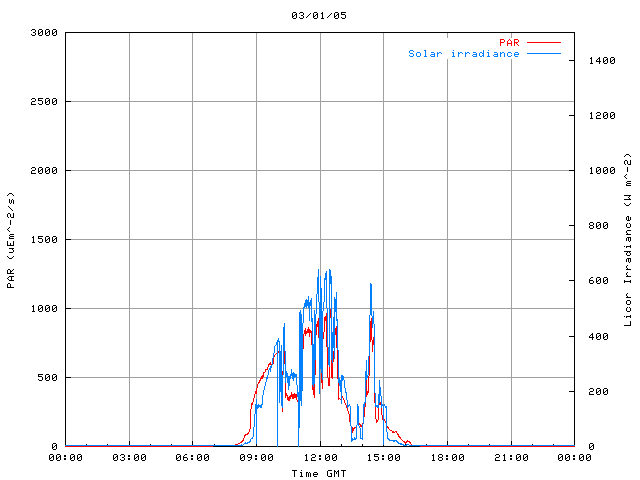 The PML meteorological station, situated on the south-west corner of the building roof, consists of a Hygroclip S3 temperature and humidity sensor housed in a radiation shield, a Mierij Meteo solid state wind sensor (MMW-005), a Chelsea instruments half-hemisphere PAR sensor, a Li-Cor pyranometer (LI-200SZ) and an Omni Instruments 6" tipping bucket raingauge (RG200). The data are logged every 5 minutes using a Pace Scientific XR5 data logger. The real-time rainfall data is likely in error - the correct values will be displayed after a time lag of approximately 24 hours. The meteorological station is sheltered from winds in the north-east and underestimates winds from this quarter. To use these data please contact Dr Tim Smyth.
