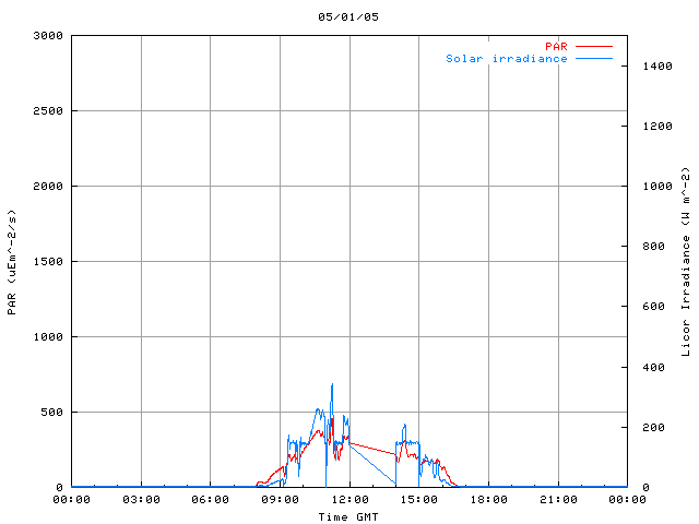 The PML meteorological station, situated on the south-west corner of the building roof, consists of a Hygroclip S3 temperature and humidity sensor housed in a radiation shield, a Mierij Meteo solid state wind sensor (MMW-005), a Chelsea instruments half-hemisphere PAR sensor, a Li-Cor pyranometer (LI-200SZ) and an Omni Instruments 6" tipping bucket raingauge (RG200). The data are logged every 5 minutes using a Pace Scientific XR5 data logger. The real-time rainfall data is likely in error - the correct values will be displayed after a time lag of approximately 24 hours. The meteorological station is sheltered from winds in the north-east and underestimates winds from this quarter. To use these data please contact Dr Tim Smyth.