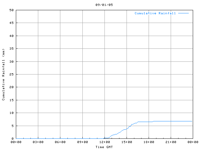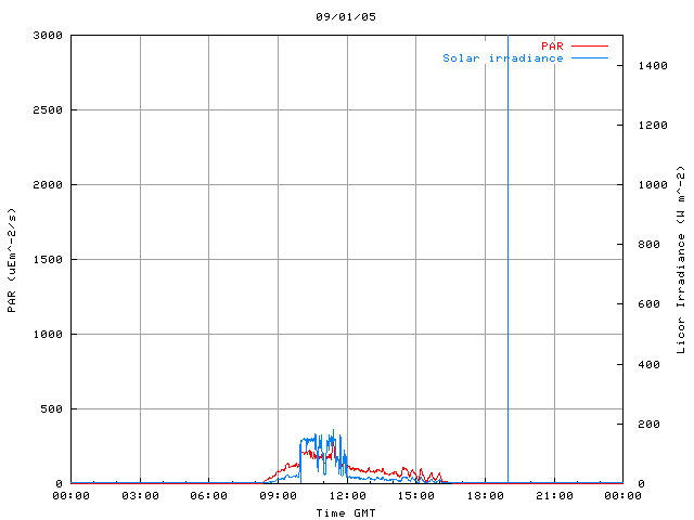 The PML meteorological station, situated on the south-west corner of the building roof, consists of a Hygroclip S3 temperature and humidity sensor housed in a radiation shield, a Mierij Meteo solid state wind sensor (MMW-005), a Chelsea instruments half-hemisphere PAR sensor, a Li-Cor pyranometer (LI-200SZ) and an Omni Instruments 6" tipping bucket raingauge (RG200). The data are logged every 5 minutes using a Pace Scientific XR5 data logger. The real-time rainfall data is likely in error - the correct values will be displayed after a time lag of approximately 24 hours. The meteorological station is sheltered from winds in the north-east and underestimates winds from this quarter. To use these data please contact Dr Tim Smyth.