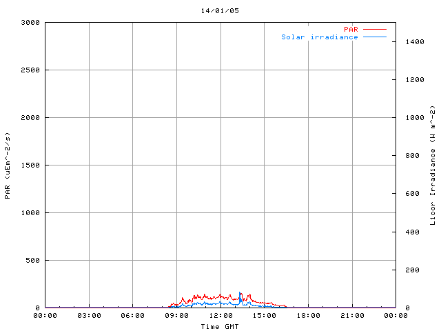 The PML meteorological station, situated on the south-west corner of the building roof, consists of a Hygroclip S3 temperature and humidity sensor housed in a radiation shield, a Mierij Meteo solid state wind sensor (MMW-005), a Chelsea instruments half-hemisphere PAR sensor, a Li-Cor pyranometer (LI-200SZ) and an Omni Instruments 6" tipping bucket raingauge (RG200). The data are logged every 5 minutes using a Pace Scientific XR5 data logger. The real-time rainfall data is likely in error - the correct values will be displayed after a time lag of approximately 24 hours. The meteorological station is sheltered from winds in the north-east and underestimates winds from this quarter. To use these data please contact Dr Tim Smyth.