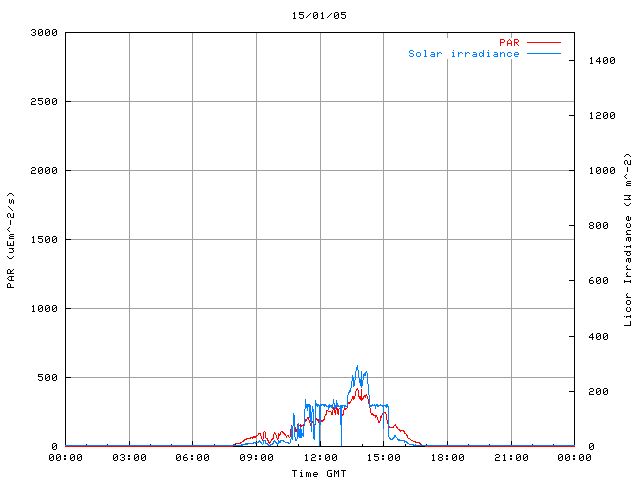 The PML meteorological station, situated on the south-west corner of the building roof, consists of a Hygroclip S3 temperature and humidity sensor housed in a radiation shield, a Mierij Meteo solid state wind sensor (MMW-005), a Chelsea instruments half-hemisphere PAR sensor, a Li-Cor pyranometer (LI-200SZ) and an Omni Instruments 6" tipping bucket raingauge (RG200). The data are logged every 5 minutes using a Pace Scientific XR5 data logger. The real-time rainfall data is likely in error - the correct values will be displayed after a time lag of approximately 24 hours. The meteorological station is sheltered from winds in the north-east and underestimates winds from this quarter. To use these data please contact Dr Tim Smyth.