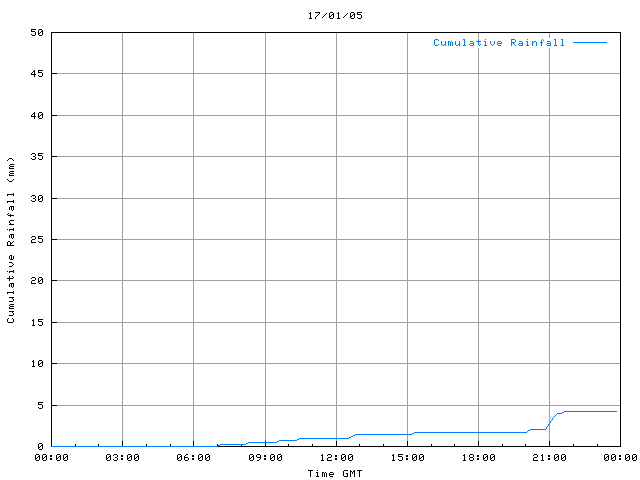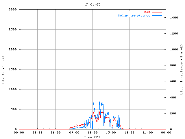 The PML meteorological station, situated on the south-west corner of the building roof, consists of a Hygroclip S3 temperature and humidity sensor housed in a radiation shield, a Mierij Meteo solid state wind sensor (MMW-005), a Chelsea instruments half-hemisphere PAR sensor, a Li-Cor pyranometer (LI-200SZ) and an Omni Instruments 6" tipping bucket raingauge (RG200). The data are logged every 5 minutes using a Pace Scientific XR5 data logger. The real-time rainfall data is likely in error - the correct values will be displayed after a time lag of approximately 24 hours. The meteorological station is sheltered from winds in the north-east and underestimates winds from this quarter. To use these data please contact Dr Tim Smyth.