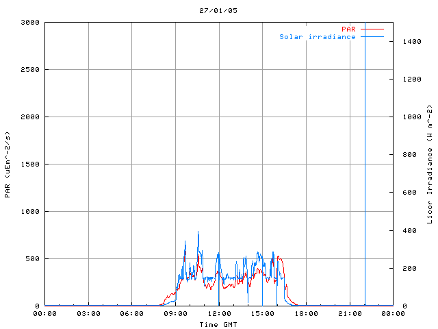 The PML meteorological station, situated on the south-west corner of the building roof, consists of a Hygroclip S3 temperature and humidity sensor housed in a radiation shield, a Mierij Meteo solid state wind sensor (MMW-005), a Chelsea instruments half-hemisphere PAR sensor, a Li-Cor pyranometer (LI-200SZ) and an Omni Instruments 6" tipping bucket raingauge (RG200). The data are logged every 5 minutes using a Pace Scientific XR5 data logger. The real-time rainfall data is likely in error - the correct values will be displayed after a time lag of approximately 24 hours. The meteorological station is sheltered from winds in the north-east and underestimates winds from this quarter. To use these data please contact Dr Tim Smyth.