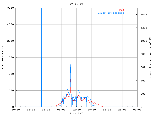The PML meteorological station, situated on the south-west corner of the building roof, consists of a Hygroclip S3 temperature and humidity sensor housed in a radiation shield, a Mierij Meteo solid state wind sensor (MMW-005), a Chelsea instruments half-hemisphere PAR sensor, a Li-Cor pyranometer (LI-200SZ) and an Omni Instruments 6" tipping bucket raingauge (RG200). The data are logged every 5 minutes using a Pace Scientific XR5 data logger. The real-time rainfall data is likely in error - the correct values will be displayed after a time lag of approximately 24 hours. The meteorological station is sheltered from winds in the north-east and underestimates winds from this quarter. To use these data please contact Dr Tim Smyth.