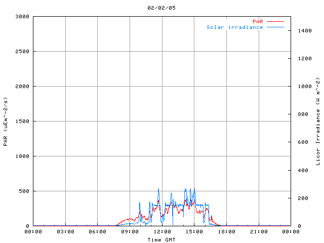 The PML meteorological station, situated on the south-west corner of the building roof, consists of a Hygroclip S3 temperature and humidity sensor housed in a radiation shield, a Mierij Meteo solid state wind sensor (MMW-005), a Chelsea instruments half-hemisphere PAR sensor, a Li-Cor pyranometer (LI-200SZ) and an Omni Instruments 6" tipping bucket raingauge (RG200). The data are logged every 5 minutes using a Pace Scientific XR5 data logger. The real-time rainfall data is likely in error - the correct values will be displayed after a time lag of approximately 24 hours. The meteorological station is sheltered from winds in the north-east and underestimates winds from this quarter. To use these data please contact Dr Tim Smyth.