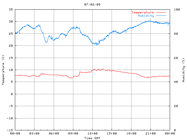 The PML meteorological station, situated on the south-west corner of the building roof, consists of a Hygroclip S3 temperature and humidity sensor housed in a radiation shield, a Mierij Meteo solid state wind sensor (MMW-005), a Chelsea instruments half-hemisphere PAR sensor, a Li-Cor pyranometer (LI-200SZ) and an Omni Instruments 6" tipping bucket raingauge (RG200). The data are logged every 5 minutes using a Pace Scientific XR5 data logger. The real-time rainfall data is likely in error - the correct values will be displayed after a time lag of approximately 24 hours. The meteorological station is sheltered from winds in the north-east and underestimates winds from this quarter. To use these data please contact Dr Tim Smyth.