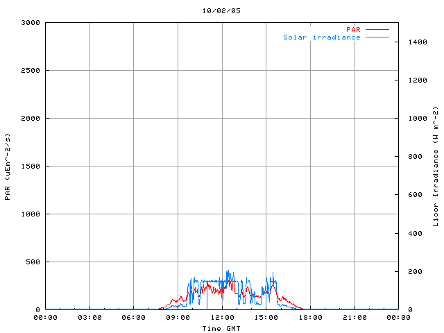 The PML meteorological station, situated on the south-west corner of the building roof, consists of a Hygroclip S3 temperature and humidity sensor housed in a radiation shield, a Mierij Meteo solid state wind sensor (MMW-005), a Chelsea instruments half-hemisphere PAR sensor, a Li-Cor pyranometer (LI-200SZ) and an Omni Instruments 6" tipping bucket raingauge (RG200). The data are logged every 5 minutes using a Pace Scientific XR5 data logger. The real-time rainfall data is likely in error - the correct values will be displayed after a time lag of approximately 24 hours. The meteorological station is sheltered from winds in the north-east and underestimates winds from this quarter. To use these data please contact Dr Tim Smyth.