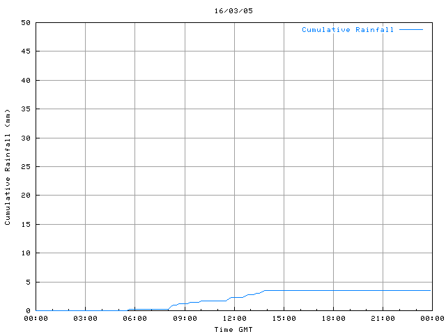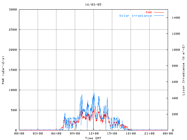The PML meteorological station, situated on the south-west corner of the building roof, consists of a Hygroclip S3 temperature and humidity sensor housed in a radiation shield, a Mierij Meteo solid state wind sensor (MMW-005), a Chelsea instruments half-hemisphere PAR sensor, a Li-Cor pyranometer (LI-200SZ) and an Omni Instruments 6" tipping bucket raingauge (RG200). The data are logged every 5 minutes using a Pace Scientific XR5 data logger. The real-time rainfall data is likely in error - the correct values will be displayed after a time lag of approximately 24 hours. The meteorological station is sheltered from winds in the north-east and underestimates winds from this quarter. To use these data please contact Dr Tim Smyth.