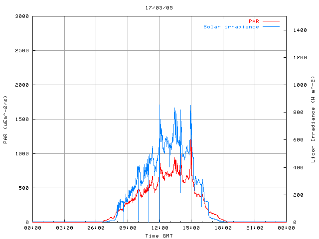 The PML meteorological station, situated on the south-west corner of the building roof, consists of a Hygroclip S3 temperature and humidity sensor housed in a radiation shield, a Mierij Meteo solid state wind sensor (MMW-005), a Chelsea instruments half-hemisphere PAR sensor, a Li-Cor pyranometer (LI-200SZ) and an Omni Instruments 6" tipping bucket raingauge (RG200). The data are logged every 5 minutes using a Pace Scientific XR5 data logger. The real-time rainfall data is likely in error - the correct values will be displayed after a time lag of approximately 24 hours. The meteorological station is sheltered from winds in the north-east and underestimates winds from this quarter. To use these data please contact Dr Tim Smyth.