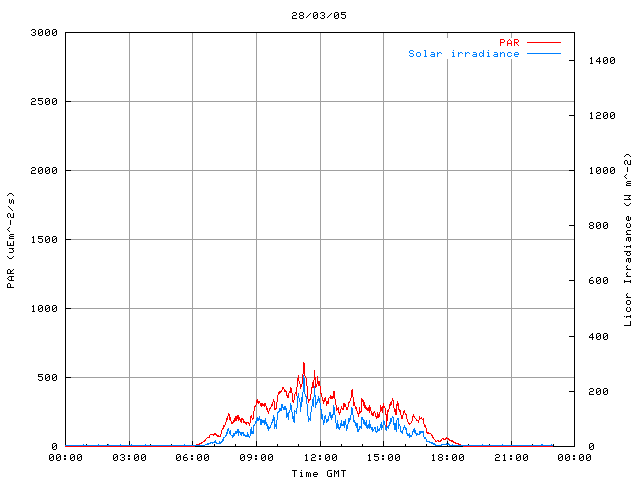 The PML meteorological station, situated on the south-west corner of the building roof, consists of a Hygroclip S3 temperature and humidity sensor housed in a radiation shield, a Mierij Meteo solid state wind sensor (MMW-005), a Chelsea instruments half-hemisphere PAR sensor, a Li-Cor pyranometer (LI-200SZ) and an Omni Instruments 6" tipping bucket raingauge (RG200). The data are logged every 5 minutes using a Pace Scientific XR5 data logger. The real-time rainfall data is likely in error - the correct values will be displayed after a time lag of approximately 24 hours. The meteorological station is sheltered from winds in the north-east and underestimates winds from this quarter. To use these data please contact Dr Tim Smyth.