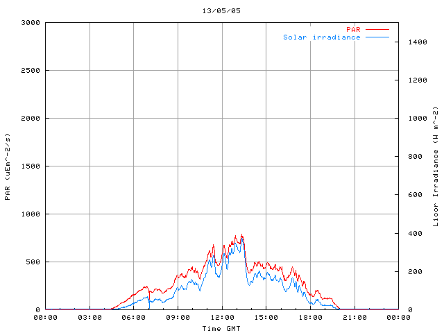 The PML meteorological station, situated on the south-west corner of the building roof, consists of a Hygroclip S3 temperature and humidity sensor housed in a radiation shield, a Mierij Meteo solid state wind sensor (MMW-005), a Chelsea instruments half-hemisphere PAR sensor, a Li-Cor pyranometer (LI-200SZ) and an Omni Instruments 6" tipping bucket raingauge (RG200). The data are logged every 5 minutes using a Pace Scientific XR5 data logger. The real-time rainfall data is likely in error - the correct values will be displayed after a time lag of approximately 24 hours. The meteorological station is sheltered from winds in the north-east and underestimates winds from this quarter. To use these data please contact Dr Tim Smyth.