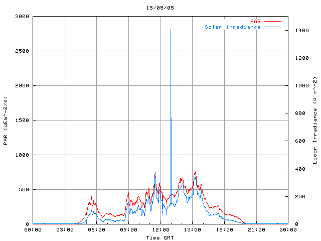 The PML meteorological station, situated on the south-west corner of the building roof, consists of a Hygroclip S3 temperature and humidity sensor housed in a radiation shield, a Mierij Meteo solid state wind sensor (MMW-005), a Chelsea instruments half-hemisphere PAR sensor, a Li-Cor pyranometer (LI-200SZ) and an Omni Instruments 6" tipping bucket raingauge (RG200). The data are logged every 5 minutes using a Pace Scientific XR5 data logger. The real-time rainfall data is likely in error - the correct values will be displayed after a time lag of approximately 24 hours. The meteorological station is sheltered from winds in the north-east and underestimates winds from this quarter. To use these data please contact Dr Tim Smyth.