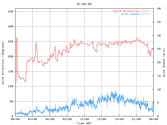 - Max Wind Speed: 9.5 ms-1 Time: 16:40:39 GMT