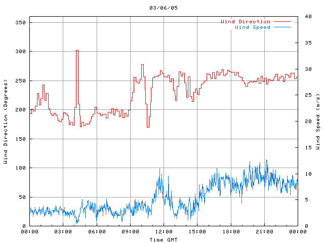 - Max Wind Speed: 12.7 ms-1 Time: 21:10:41 GMT