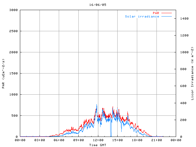 The PML meteorological station, situated on the south-west corner of the building roof, consists of a Hygroclip S3 temperature and humidity sensor housed in a radiation shield, a Mierij Meteo solid state wind sensor (MMW-005), a Chelsea instruments half-hemisphere PAR sensor, a Li-Cor pyranometer (LI-200SZ) and an Omni Instruments 6" tipping bucket raingauge (RG200). The data are logged every 5 minutes using a Pace Scientific XR5 data logger. The real-time rainfall data is likely in error - the correct values will be displayed after a time lag of approximately 24 hours. The meteorological station is sheltered from winds in the north-east and underestimates winds from this quarter. To use these data please contact Dr Tim Smyth.