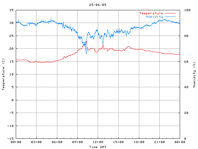 The PML meteorological station, situated on the south-west corner of the building roof, consists of a Hygroclip S3 temperature and humidity sensor housed in a radiation shield, a Mierij Meteo solid state wind sensor (MMW-005), a Chelsea instruments half-hemisphere PAR sensor, a Li-Cor pyranometer (LI-200SZ) and an Omni Instruments 6" tipping bucket raingauge (RG200). The data are logged every 5 minutes using a Pace Scientific XR5 data logger. The real-time rainfall data is likely in error - the correct values will be displayed after a time lag of approximately 24 hours. The meteorological station is sheltered from winds in the north-east and underestimates winds from this quarter. To use these data please contact Dr Tim Smyth.