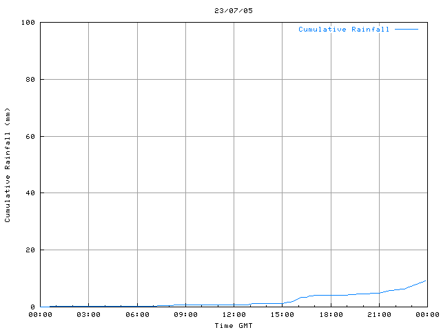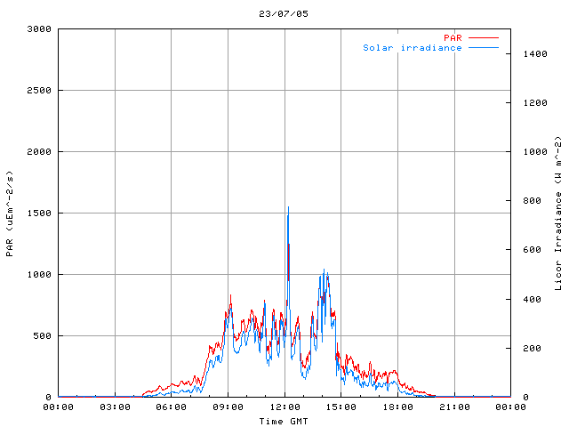 The PML meteorological station, situated on the south-west corner of the building roof, consists of a Hygroclip S3 temperature and humidity sensor housed in a radiation shield, a Mierij Meteo solid state wind sensor (MMW-005), a Chelsea instruments half-hemisphere PAR sensor, a Li-Cor pyranometer (LI-200SZ) and an Omni Instruments 6" tipping bucket raingauge (RG200). The data are logged every 5 minutes using a Pace Scientific XR5 data logger. The real-time rainfall data is likely in error - the correct values will be displayed after a time lag of approximately 24 hours. The meteorological station is sheltered from winds in the north-east and underestimates winds from this quarter. To use these data please contact Dr Tim Smyth.