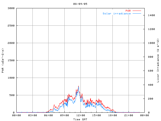 The PML meteorological station, situated on the south-west corner of the building roof, consists of a Hygroclip S3 temperature and humidity sensor housed in a radiation shield, a Mierij Meteo solid state wind sensor (MMW-005), a Chelsea instruments half-hemisphere PAR sensor, a Li-Cor pyranometer (LI-200SZ) and an Omni Instruments 6" tipping bucket raingauge (RG200). The data are logged every 5 minutes using a Pace Scientific XR5 data logger. The real-time rainfall data is likely in error - the correct values will be displayed after a time lag of approximately 24 hours. The meteorological station is sheltered from winds in the north-east and underestimates winds from this quarter. To use these data please contact Dr Tim Smyth.