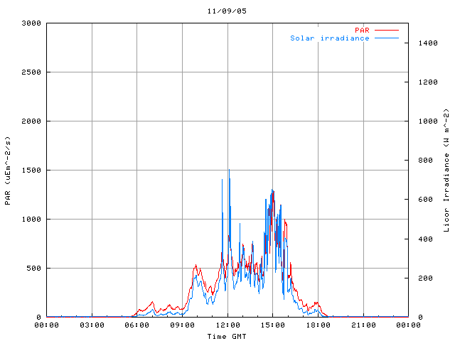 The PML meteorological station, situated on the south-west corner of the building roof, consists of a Hygroclip S3 temperature and humidity sensor housed in a radiation shield, a Mierij Meteo solid state wind sensor (MMW-005), a Chelsea instruments half-hemisphere PAR sensor, a Li-Cor pyranometer (LI-200SZ) and an Omni Instruments 6" tipping bucket raingauge (RG200). The data are logged every 5 minutes using a Pace Scientific XR5 data logger. The real-time rainfall data is likely in error - the correct values will be displayed after a time lag of approximately 24 hours. The meteorological station is sheltered from winds in the north-east and underestimates winds from this quarter. To use these data please contact Dr Tim Smyth.