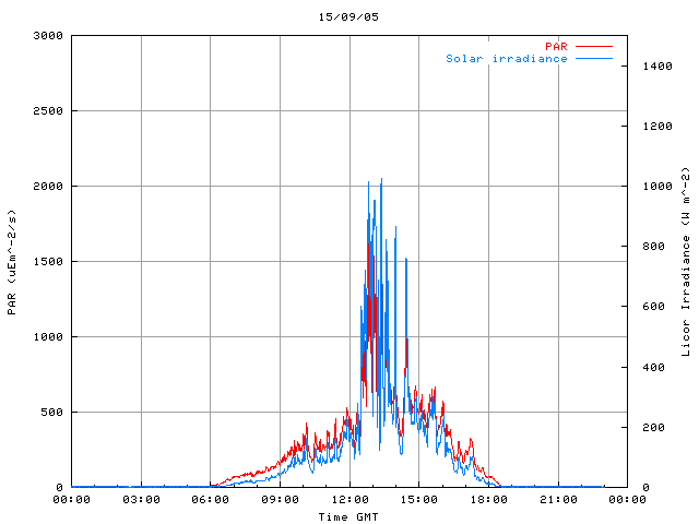 The PML meteorological station, situated on the south-west corner of the building roof, consists of a Hygroclip S3 temperature and humidity sensor housed in a radiation shield, a Mierij Meteo solid state wind sensor (MMW-005), a Chelsea instruments half-hemisphere PAR sensor, a Li-Cor pyranometer (LI-200SZ) and an Omni Instruments 6" tipping bucket raingauge (RG200). The data are logged every 5 minutes using a Pace Scientific XR5 data logger. The real-time rainfall data is likely in error - the correct values will be displayed after a time lag of approximately 24 hours. The meteorological station is sheltered from winds in the north-east and underestimates winds from this quarter. To use these data please contact Dr Tim Smyth.
