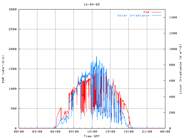 The PML meteorological station, situated on the south-west corner of the building roof, consists of a Hygroclip S3 temperature and humidity sensor housed in a radiation shield, a Mierij Meteo solid state wind sensor (MMW-005), a Chelsea instruments half-hemisphere PAR sensor, a Li-Cor pyranometer (LI-200SZ) and an Omni Instruments 6" tipping bucket raingauge (RG200). The data are logged every 5 minutes using a Pace Scientific XR5 data logger. The real-time rainfall data is likely in error - the correct values will be displayed after a time lag of approximately 24 hours. The meteorological station is sheltered from winds in the north-east and underestimates winds from this quarter. To use these data please contact Dr Tim Smyth.