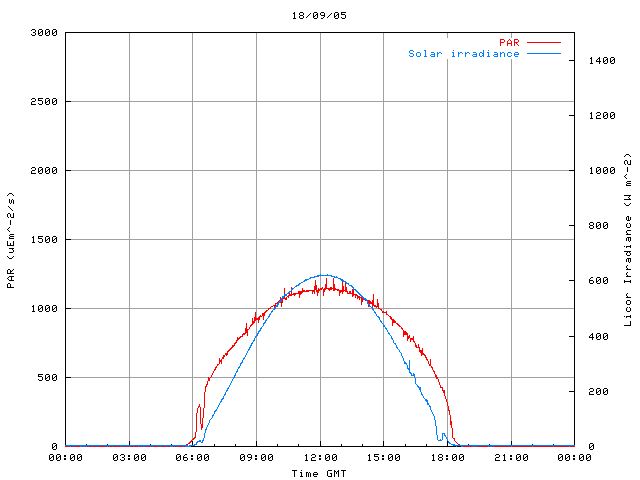 The PML meteorological station, situated on the south-west corner of the building roof, consists of a Hygroclip S3 temperature and humidity sensor housed in a radiation shield, a Mierij Meteo solid state wind sensor (MMW-005), a Chelsea instruments half-hemisphere PAR sensor, a Li-Cor pyranometer (LI-200SZ) and an Omni Instruments 6" tipping bucket raingauge (RG200). The data are logged every 5 minutes using a Pace Scientific XR5 data logger. The real-time rainfall data is likely in error - the correct values will be displayed after a time lag of approximately 24 hours. The meteorological station is sheltered from winds in the north-east and underestimates winds from this quarter. To use these data please contact Dr Tim Smyth.