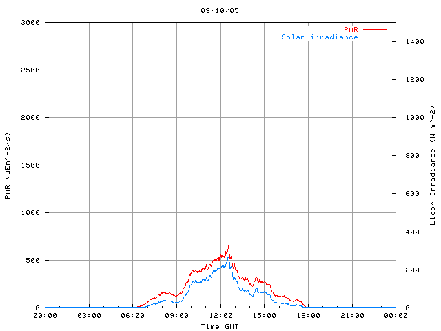 The PML meteorological station, situated on the south-west corner of the building roof, consists of a Hygroclip S3 temperature and humidity sensor housed in a radiation shield, a Mierij Meteo solid state wind sensor (MMW-005), a Chelsea instruments half-hemisphere PAR sensor, a Li-Cor pyranometer (LI-200SZ) and an Omni Instruments 6" tipping bucket raingauge (RG200). The data are logged every 5 minutes using a Pace Scientific XR5 data logger. The real-time rainfall data is likely in error - the correct values will be displayed after a time lag of approximately 24 hours. The meteorological station is sheltered from winds in the north-east and underestimates winds from this quarter. To use these data please contact Dr Tim Smyth.