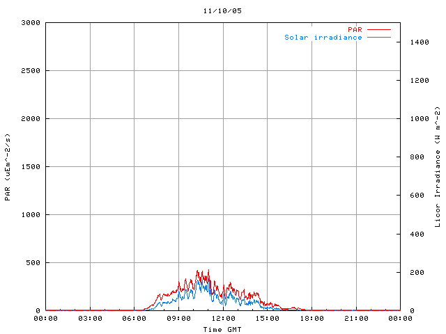 The PML meteorological station, situated on the south-west corner of the building roof, consists of a Hygroclip S3 temperature and humidity sensor housed in a radiation shield, a Mierij Meteo solid state wind sensor (MMW-005), a Chelsea instruments half-hemisphere PAR sensor, a Li-Cor pyranometer (LI-200SZ) and an Omni Instruments 6" tipping bucket raingauge (RG200). The data are logged every 5 minutes using a Pace Scientific XR5 data logger. The real-time rainfall data is likely in error - the correct values will be displayed after a time lag of approximately 24 hours. The meteorological station is sheltered from winds in the north-east and underestimates winds from this quarter. To use these data please contact Dr Tim Smyth.