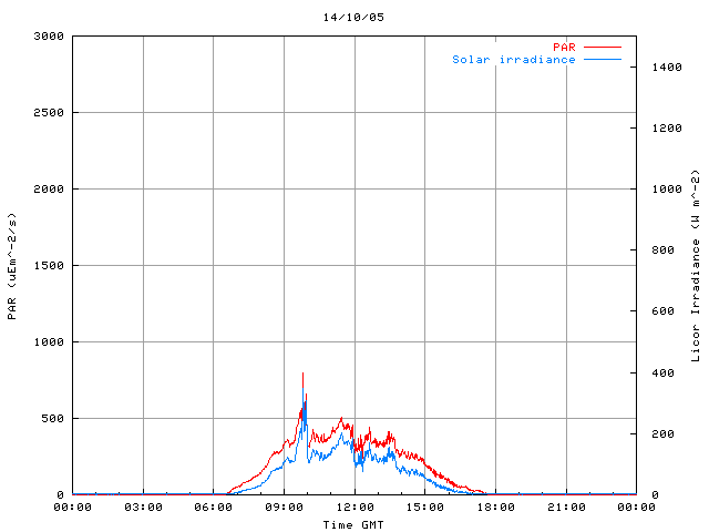 The PML meteorological station, situated on the south-west corner of the building roof, consists of a Hygroclip S3 temperature and humidity sensor housed in a radiation shield, a Mierij Meteo solid state wind sensor (MMW-005), a Chelsea instruments half-hemisphere PAR sensor, a Li-Cor pyranometer (LI-200SZ) and an Omni Instruments 6" tipping bucket raingauge (RG200). The data are logged every 5 minutes using a Pace Scientific XR5 data logger. The real-time rainfall data is likely in error - the correct values will be displayed after a time lag of approximately 24 hours. The meteorological station is sheltered from winds in the north-east and underestimates winds from this quarter. To use these data please contact Dr Tim Smyth.