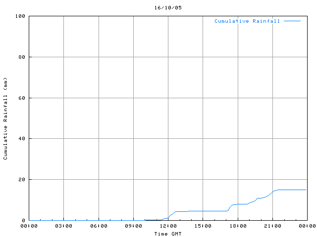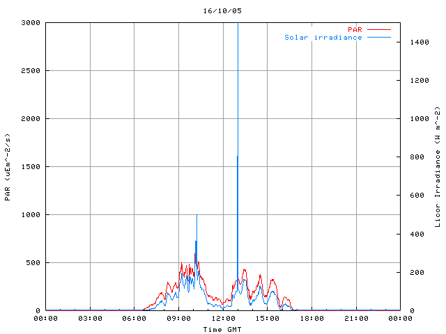 The PML meteorological station, situated on the south-west corner of the building roof, consists of a Hygroclip S3 temperature and humidity sensor housed in a radiation shield, a Mierij Meteo solid state wind sensor (MMW-005), a Chelsea instruments half-hemisphere PAR sensor, a Li-Cor pyranometer (LI-200SZ) and an Omni Instruments 6" tipping bucket raingauge (RG200). The data are logged every 5 minutes using a Pace Scientific XR5 data logger. The real-time rainfall data is likely in error - the correct values will be displayed after a time lag of approximately 24 hours. The meteorological station is sheltered from winds in the north-east and underestimates winds from this quarter. To use these data please contact Dr Tim Smyth.